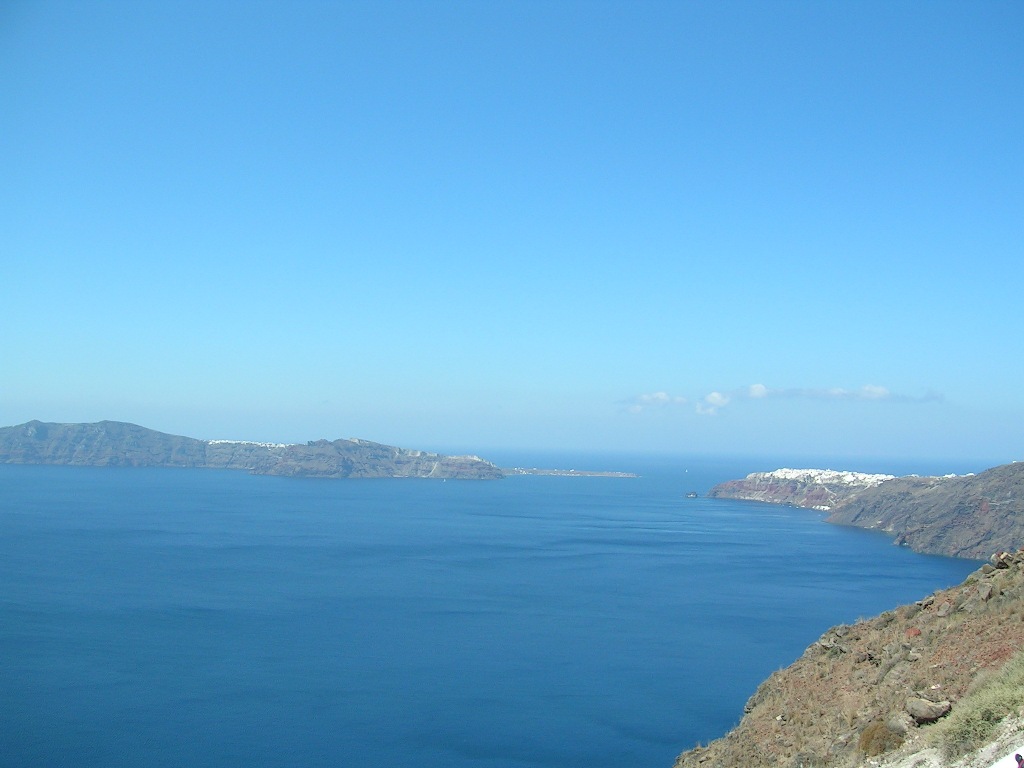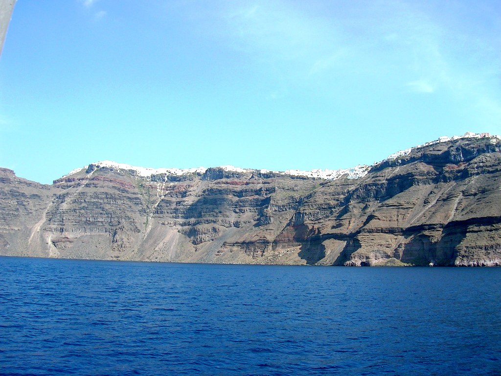 もうホテル・チェックアウトの日です。アテネへのフライトは夜発なので、フィラへ出て、目に留まった旅行会社にふらっと入り、所要時間2時間の「火山島へ行くボートツアー」を申込みました。