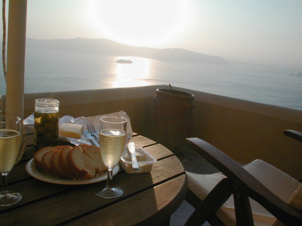 「向こうに見えるあの白いところは、きっとイアの街ね。行ってみなくちゃね。」などと話していると、「ウェルカム・ドリンクです。」とキール・ロワイヤルが届きました。
