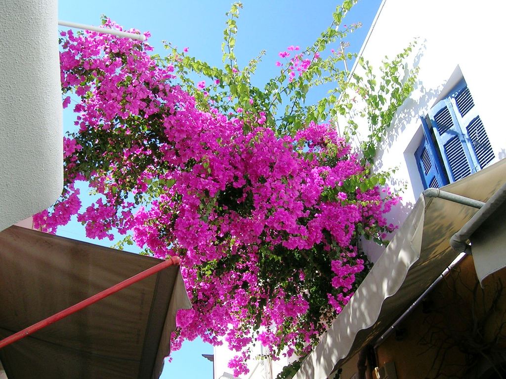 小道を散策しながら、目に飛び込んできた鮮やかなブーゲンビリア。白い壁と青い空に映えますねぇ。