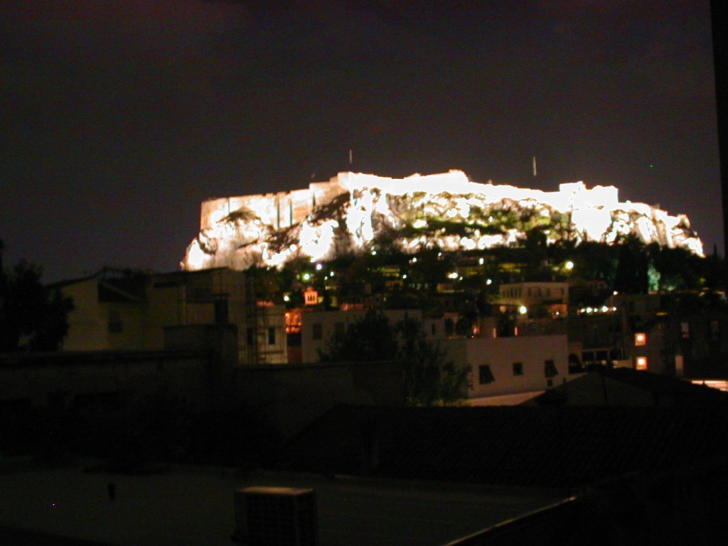 アテネ市内の夜景と、ライトアップされた遺跡の神殿も見られました。キレイー!