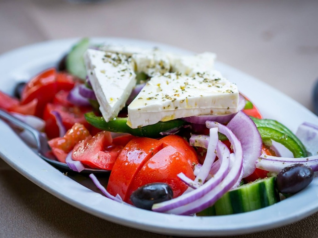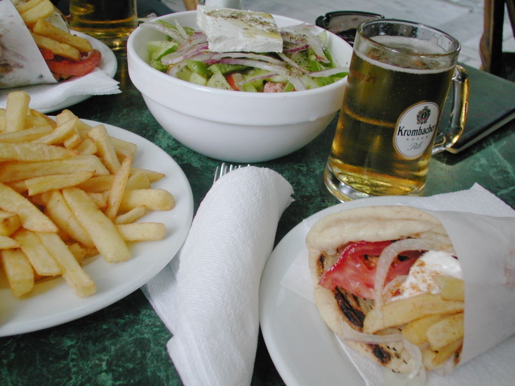ギロピタは、平たい丸いパンに焼いたお肉、野菜、ヨーグルト、フライドポテトなどを巻いたサンドイッチのようなものです。それと、おいしくてすっかり気に入ったしまったグリーク・サラダ。