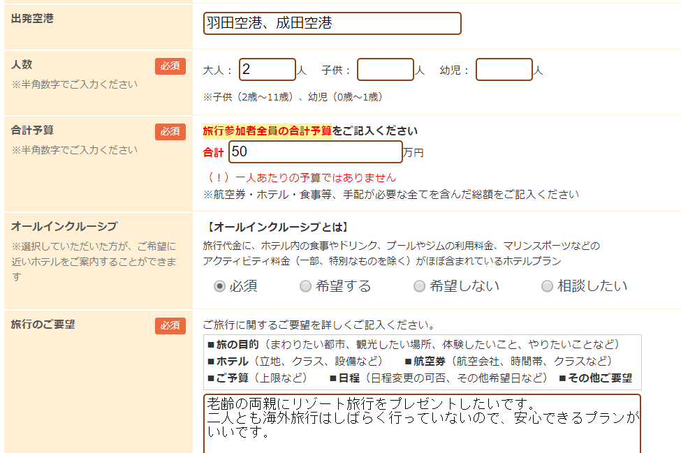 予算は旅行参加者全員の合計金額です。一人あたまの計算ではないのでお気をつけください。
