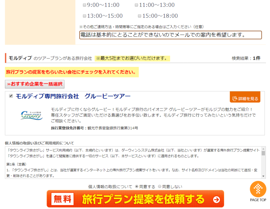 そしてツアープランを提案してくれる会社を選択。