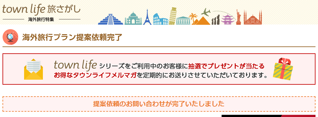 先ほどからたびたび名前をあげている「タウンライフ 旅さがし」は、旅行に行きたい人をサポートする海外旅行プラン一括依頼サイト 」です。