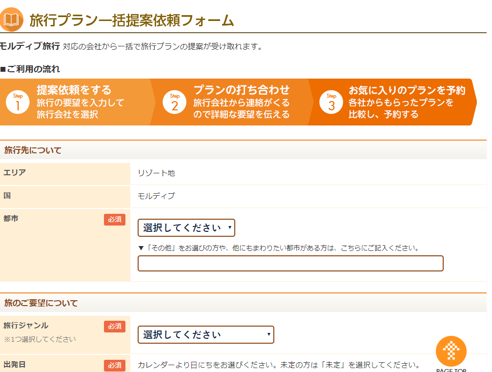 一括フォームにとぶので、都市や旅行のジャンル、日付等を選択します。