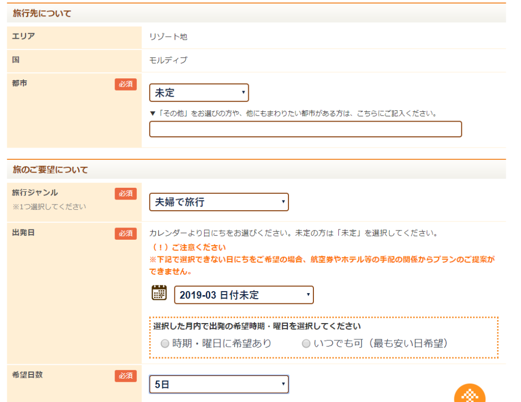 今回は私は両親にリゾート旅行をプレゼントしたいので、モルディブを選ぶことにしました。あとで自分のドイツ旅行も提案依頼しちゃいます♪
