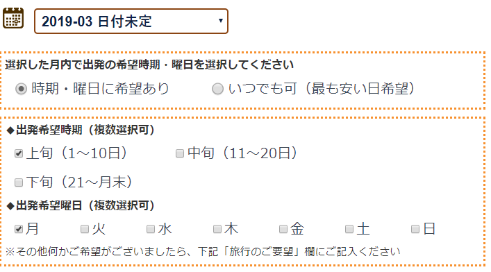 こうすれば日付は未定でも、平日が仕事な人や、学校に通うお子さんがいる人は出発日を金~日に設定すれば、平日に休むが2,3日ですみます。上旬~下旬も選べるので、月の忙しくない時期に提案してもらえますね